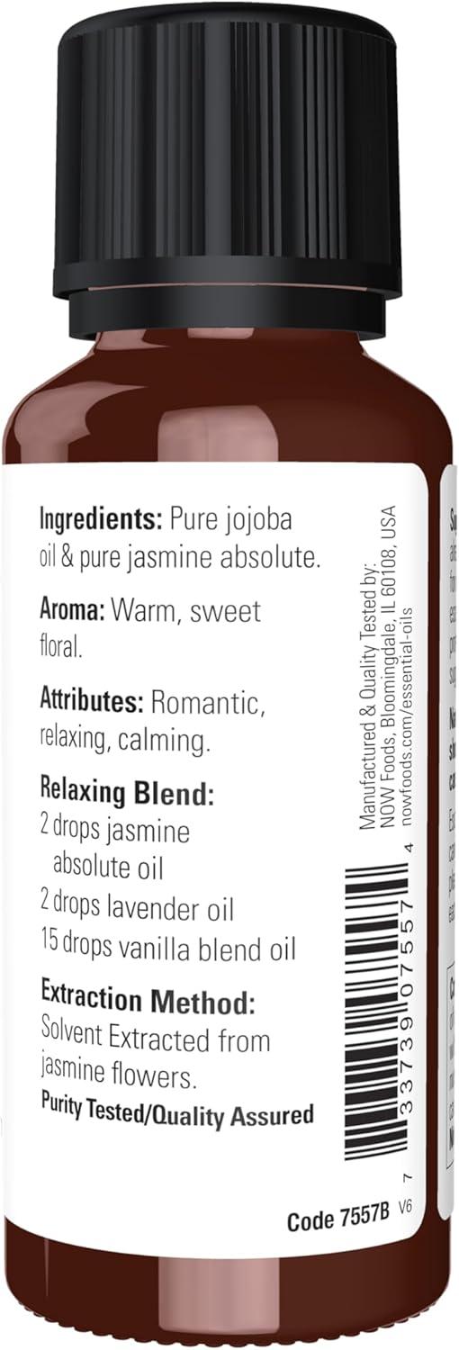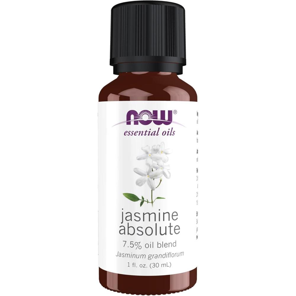 NOW Essential Oils, Jasmine Absolute Oil Blend, 7.5% Blend of Pure Jasmine Absolute Oil in Pure Jojoba Oil, Romantic Aromatherapy Scent, Vegan, Child Resistant Cap, 1-Ounce