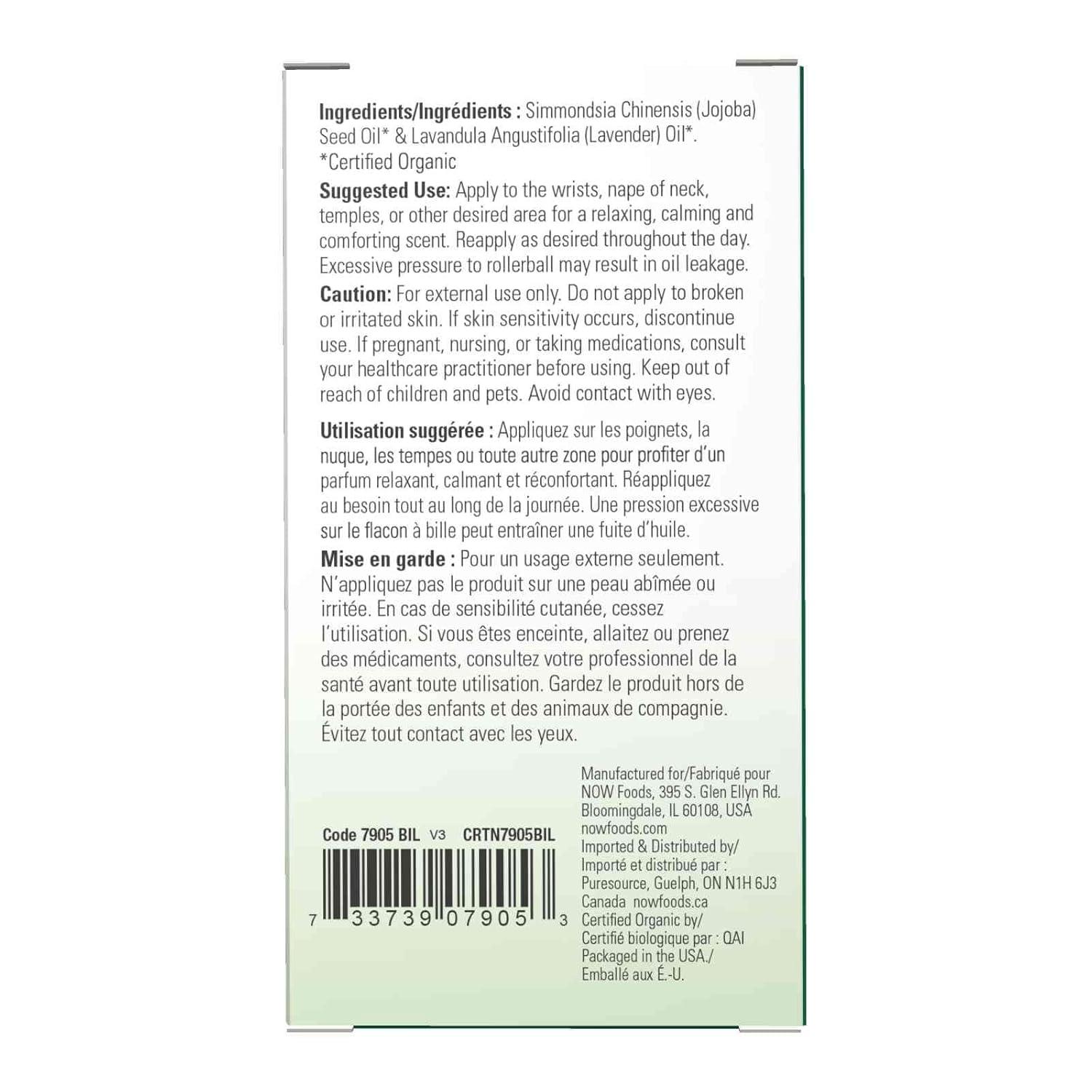 Ingredients: Simmondsia Chinensis (Jojoba) Seed Oil* & Lavandula Angustifolia (Lavender) Oil*. *Certi­fied Organic Aroma: Floral Attributes: Calming & Soothing NOW® Essential Oils are analytically tested for identity, purity, and adulteration to assure the highest quality. No synthetic fragrances or chemicals. NOW® Essential Oil products are not tested on animals. Certified Organic by QAI. Packaged in the USA.