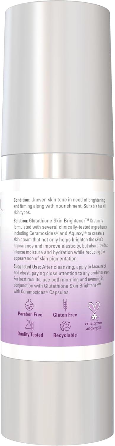 Condition: Uneven skin tone in need of brightening and firming along with nourishment. Suitable for all skin types. Solution: Glutathione Skin Brightener™ Cream is formulated with several clinically-tested ingredients including Ceramosides® and Aquaxyl® to create a skin cream that not only helps brighten the skin’s appearance and improve elasticity, but also provides intense moisture and hydration while reducing the appearance of skin pigmentation. Ingredients: Water (Aqua), Diheptyl Succinate & Capryloyl Glycerin/Sebacic Acid Copolymer, Glyceryl Stearate SE, Stearic Acid (vegetable source), Caprylic/Capric Triglyceride, Cetearyl Alcohol & Cetearyl Glucoside, Glycerin, Aquaxyl® (Xylitylglucoside/Anhydroxylitol/Xylitol), Butyrospermum Parkii (Shea) Butter (tree nut), Phenoxyethanol & Ethylhexylglycerin, Niacinamide (Niacin), Natural Aroma, Tocopherol (Vitamin E) (non-GMO soy), Maltodextrin & Punica Granatum Seed Extract, Potassium Sorbate, Xanthan Gum, Sodium Hyaluronate (Hyaluronic Acid), Ceramosides® [Triticum Vulgare (Wheat) Seed Extract], Glutathione. Aquaxyl® is a registered trademark of Seppic SA. Ceramosides® is a registered trademark of EPI France and is used under license from Seppic, Inc.