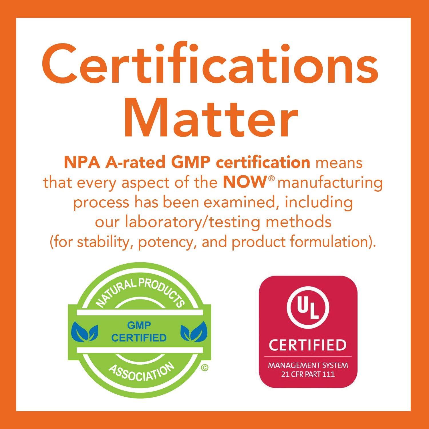 GMP Quality Assured: NPA A-rated GMP certification means that every aspect of the NOW manufacturing process has been examined, including our laboratory/testing methods (for stability, potency, and product formulation).