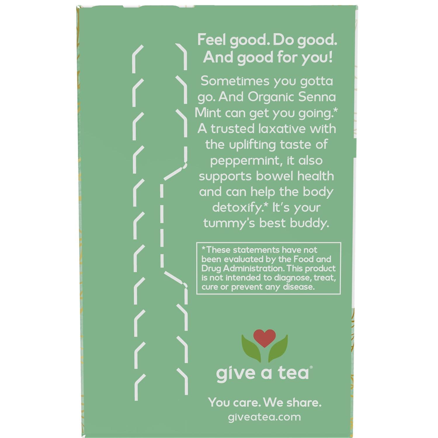 Organic Senna with Uplifting Peppermint for Gastrointestinal Relief!* Sometimes you gotta go. And Organic Senna Mint can get you going.* A trusted laxative with the uplifting taste of peppermint, it also supports bowel health and can help the body detoxify.* It’s your tummy's best buddy. Steep one tea bag in 6-8 ounces of boiling water for 4-6 minutes. Stir occasionally while steeping. Do not consume more than two cups per day. For occasional use only; do not use daily for longer than 1 to 2 weeks. Do not give to children. Notice: This product contains senna. Read and follow directions carefully. Do not use if you have or develop diarrhea, loose stools, or abdominal pain because senna may worsen these conditions and be harmful to your health. Consult your physician if you have frequent diarrhea or if you are pregnant, nursing, taking medication, or have a medical condition.